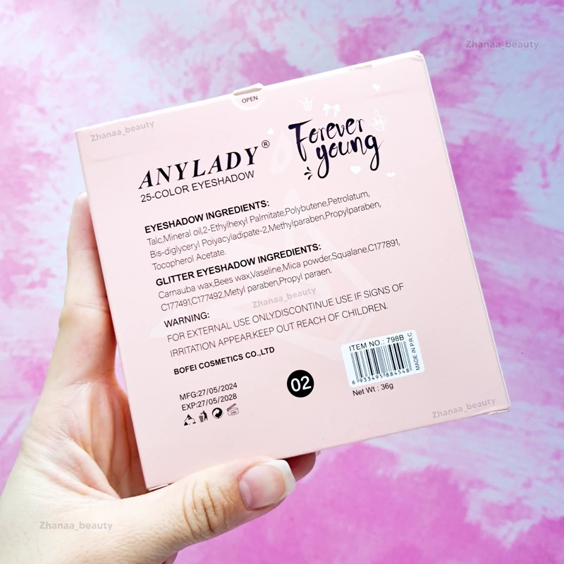 پالت سایه چشم 25 رنگ انی لیدی مدل 02 Forever Young، دارای 25 رنگ سایه، 3 رنگ گلیتر و ساخت کشور چین است. این محصول رنگ دهی و پیگمنت فوق العادهای دارند، همچنین این پالت سایه مناسب برای انواع پوست و دارای طیف جذاب و شاد است.